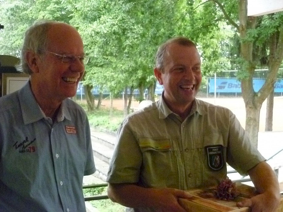 Nach der Begehung des Herbacher Waldes klang der Nachmittag in der Restauration des Tennisvereins aus. Hier überreichte CDU-Fraktionsvorsitzender Gerhard Gudduschat an Wolfgang von der Heiden ein kleines Präsent und dankte für die vielfältigen Informationen.