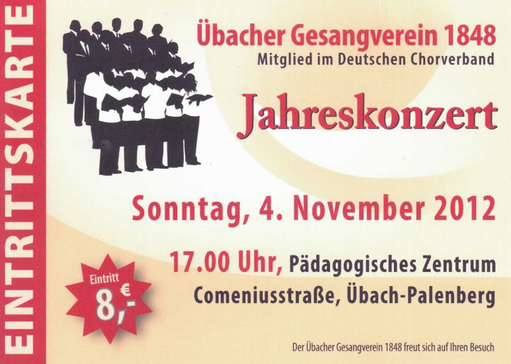 Bestimmt werden viele der heute beim Konzert Anwesenden sich das am 16. Dezember 2012 um 19:30 Uhr in der Rimburger Kirche stattfindende Chorkonzert nicht entgehen lassen, bei dem der Übacher Gesangverein dann Gast bei den niederländischen Sangesfreundinnen und Sangesfreunden sein wird. Freuen wir uns auf ein schönes und hörenswertes Weihnachtskonzert für das wir den beteiligten Sängerinnen und Sängern schon heute ein herzliches „Toi, toi, toi“ wünschen.