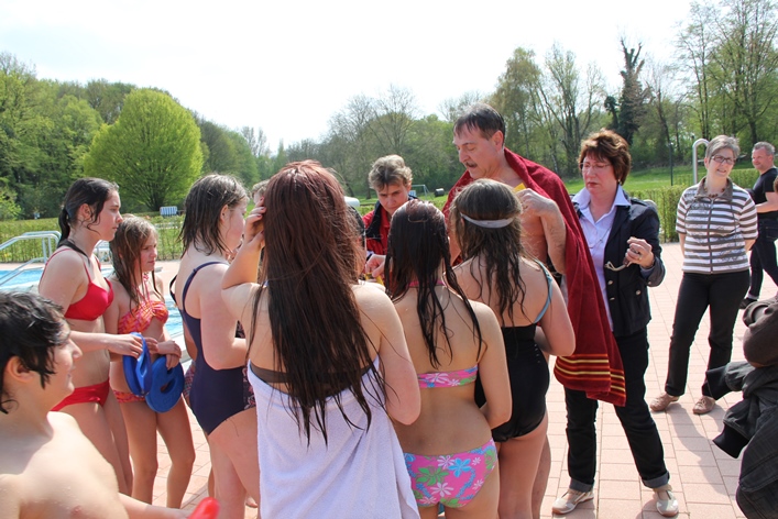 Und der Bürgermeister hatte für die Jugendlichen, die sich ebenfalls ins Freibad trauten, eine besondere Überraschung mit dabei. Alle Jugendlichen, die einen der zahlreichen Schwimmringe aus dem Wasser holten und an Schwimmeisterin Sabine Maass übereichten, bekamen durch den Bürgermeister eine Freikarte für das Ü-Bad ausgehändigt.