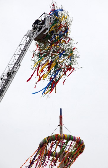 Dank der Initiative des Löschzuges Übach der Freiwilligen Feuerwehr der Stadt Übach-Palenberg unter Leitung von Löschzugführer Manfred Havertz und auch der des Gastwirtsehepaares Spiertz wird seit einigen Jahren wieder der schöne Brauch im Ortsteil Übach gepflegt, einen richtig großen Maibaum auf dem Rathausplatz aufzusetzen. So ist es auch wieder in diesem Jahr geschehen. Im Beisein von Bürgermeister Wolfgang Jungnitsch sowie der fast kompletten Vorstandsriege der CDU Übach-Palenberg und einer fast unübersehbar großen Schar Übach-Palenberger Bürgerinnen und Bürger zeigte sich die Spitze des Maibaumes in diesem Jahr nicht ganz so widerspenstig, als sie mit Hilfe von Feuerwehrdrehleiter und Führungsseilen auf den hohen Holzstamm durch mutige Männer der Übacher Feuerwehr aufgesetzt wurde. Die Scherpenseeler Privatmusikapelle sorgte derweil für die frühjahreszeitliche musikalische Stimmung.