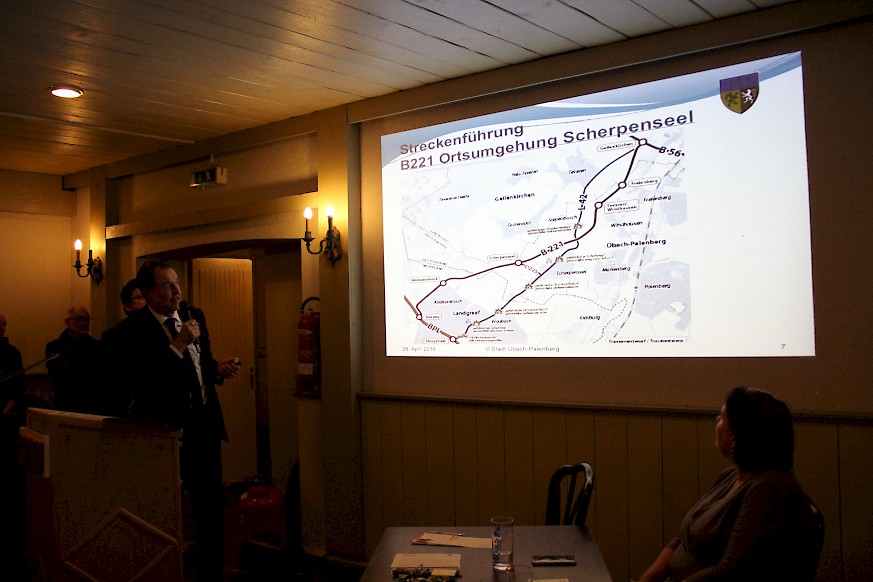 Als „Durchleitungsgemeinde“ für den Schwerlastverkehr aus den Niederlanden ist der Übach-Palenberger Ortsteil Scherpenseel ganz erheblich durch Lkw- und Pkw-Verkehr belastet. So werden alleine durch die Heerlener Straße nach Fertigstellung des Buitenrings ca. 20.000 Fahrzeuge pro Tag fahren. Scherpenseel ist dem Grunde nach ein Straßendorf, in dem die Häuser unmittelbar an der Straße liegen und auch die Grundschule unmittelbar an der Hauptverkehrsstraße, der Heerlener Straße, liegt. Für die Schulkinder birgt der Weg zur und von der Schule ein nicht zu unterschätzendes Gefährdungspotential, führte CDU-Stadtverbandsvorsitzender Oliver Walther aus, der die Moderation der Versammlung übernommen hatte, nachdem CDU-Ortsvorsitzender Dietmar Lux die vielen Bürgerinnen und Bürger begrüßt hatte, unter denen sich auch die Ortsvorsteherin von Grotenrath, Resi Hensen, Geilenkirchens Bürgermeister Georg Schmitz, die Wethouderin aus Landgraaf, Kelly Regterschot, und Übach-Palenbergs Bürgermeister Wolfgang Jungnitsch befanden. Wolfgang Jungnitsch machte in seinem Vortrag deutlich, dass in der Vergangenheit viele Gespräche mit den niederländischen Verantwortungsträgern und auch mit dem ehemaligen Bürgermeister von Geilenkirchen über mögliche Trassenführungen geführt worden sind. Auch mit seinem derzeitigen Geilenkirchener Amtskollegen hat er die Umgehungsstraße bereits thematisiert. Er entkräftete damit das von Resi Hensen vorgetragenen Argument, „mit ihnen sei nicht über die Straße gesprochen worden“.